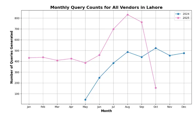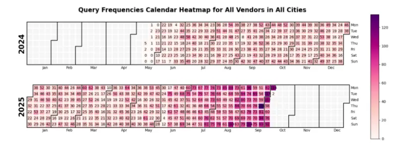 Saturdays, Sundays, and Mondays of July–September 2025 top the charts for vendor queries.