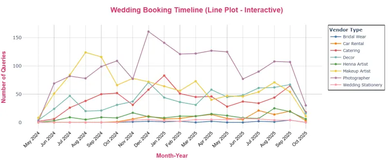 Cities have personalities of their own. Lahore plans on weekends like it’s a ritual, research, calls, decisions. Islamabad waits until the last moment and then scrambles to secure photographers within days of the event. Karachi was quiet in 2024 but our 2025 data looks very different, steadily rising interest, more bookings, more activity.