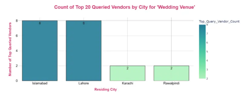 Fig 3.0: Lahore and Islamabad are stealing the wedding spotlight, each city hosts 8 of the most queried wedding venues on record.