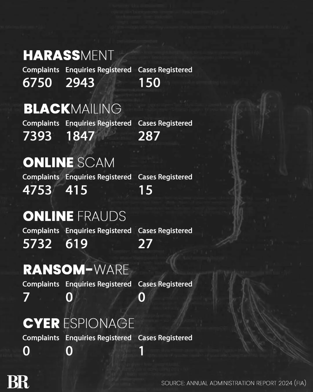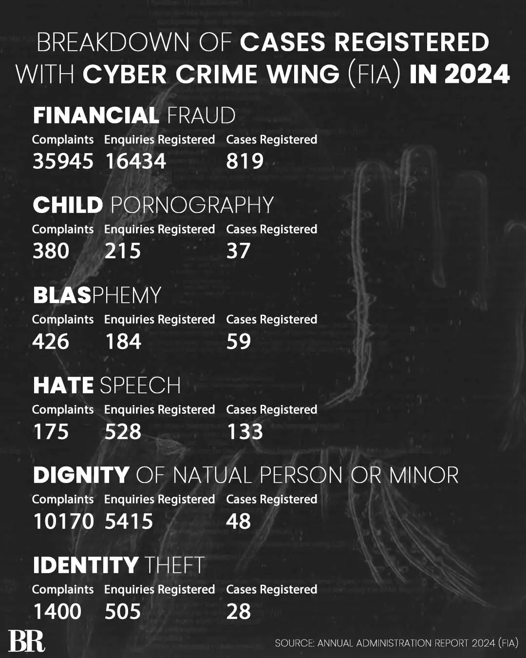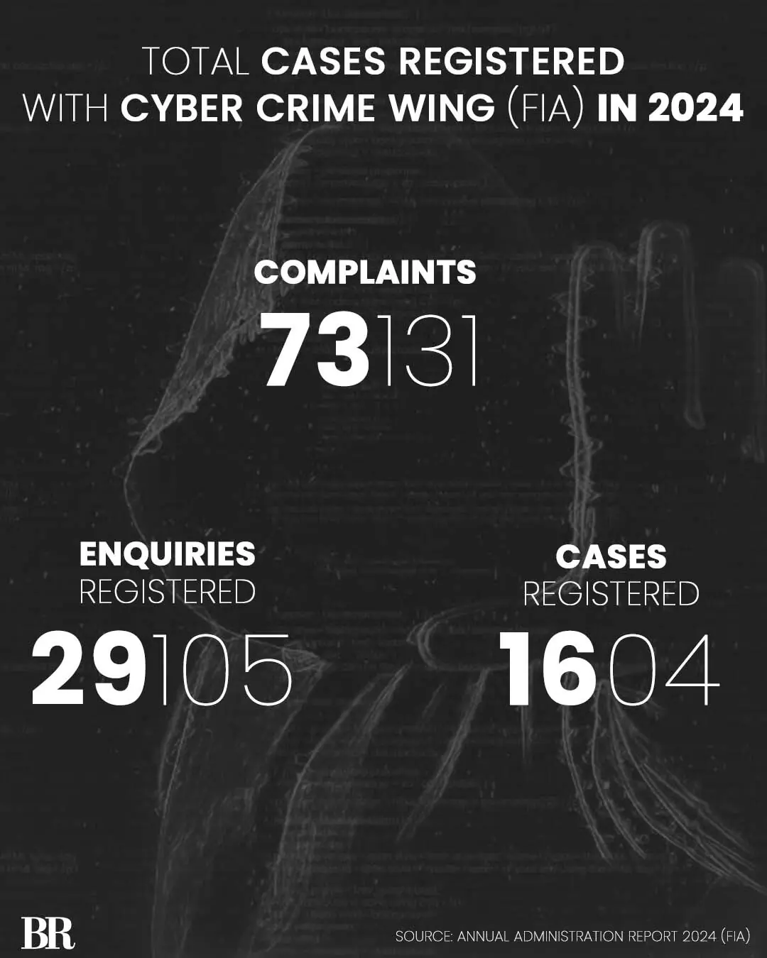 According to the Federal Investigation Agency (FIA) Annual Administration Report 2024, over 73,000 complaints were made to the agency but only 1,604 cases were registered. Moreover, nearly half of the complaints fell under the category of financial frauds.