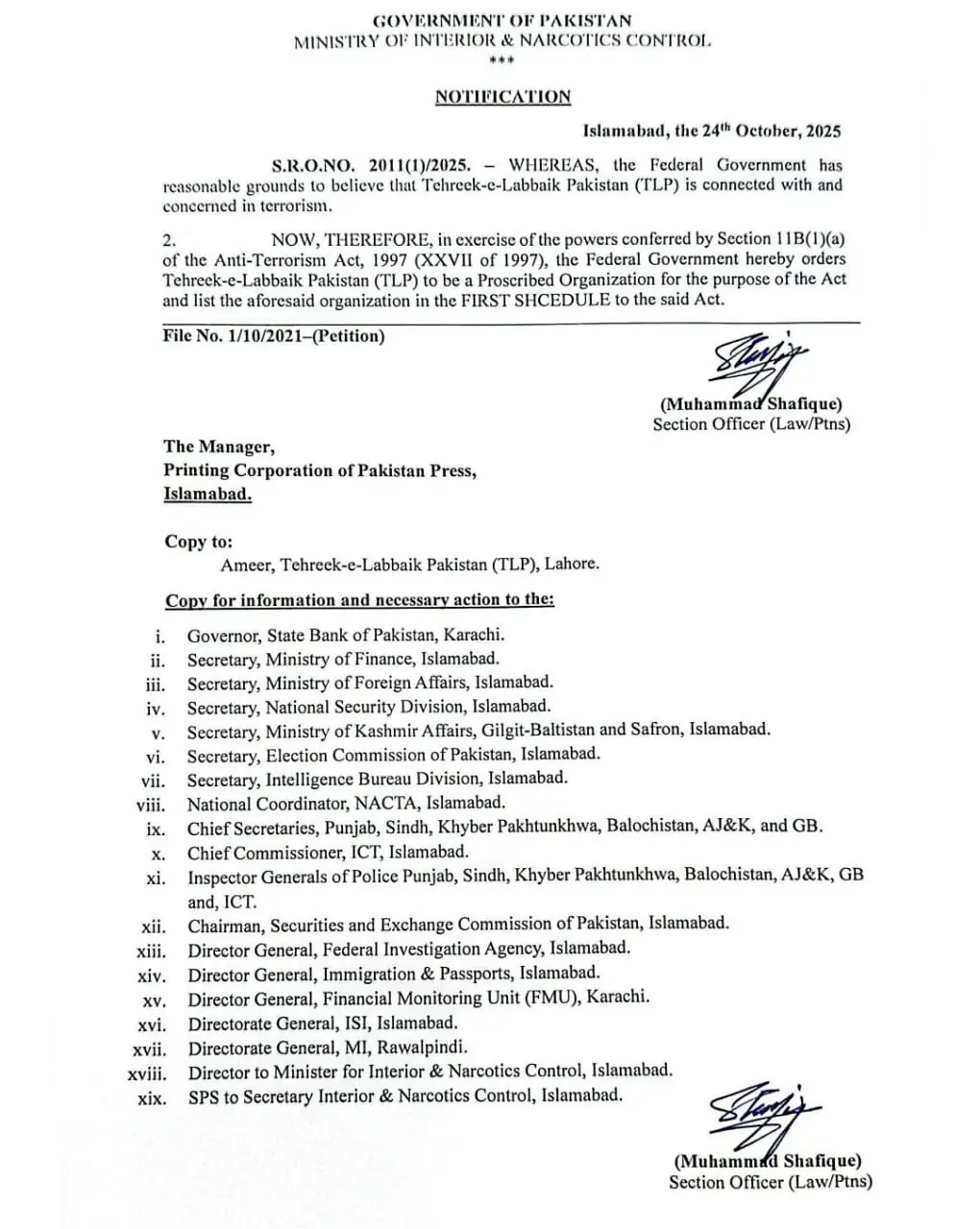“In exercise of the powers conferred by Section 11B(1)(a) of the Anti-Terrorism Act, 1997 (XXVII of 1997), the federal government hereby orders TLP to be a proscribed organisation for the purpose of the Act and list the aforesaid organisation in the first schedule to the said Act,” it read.